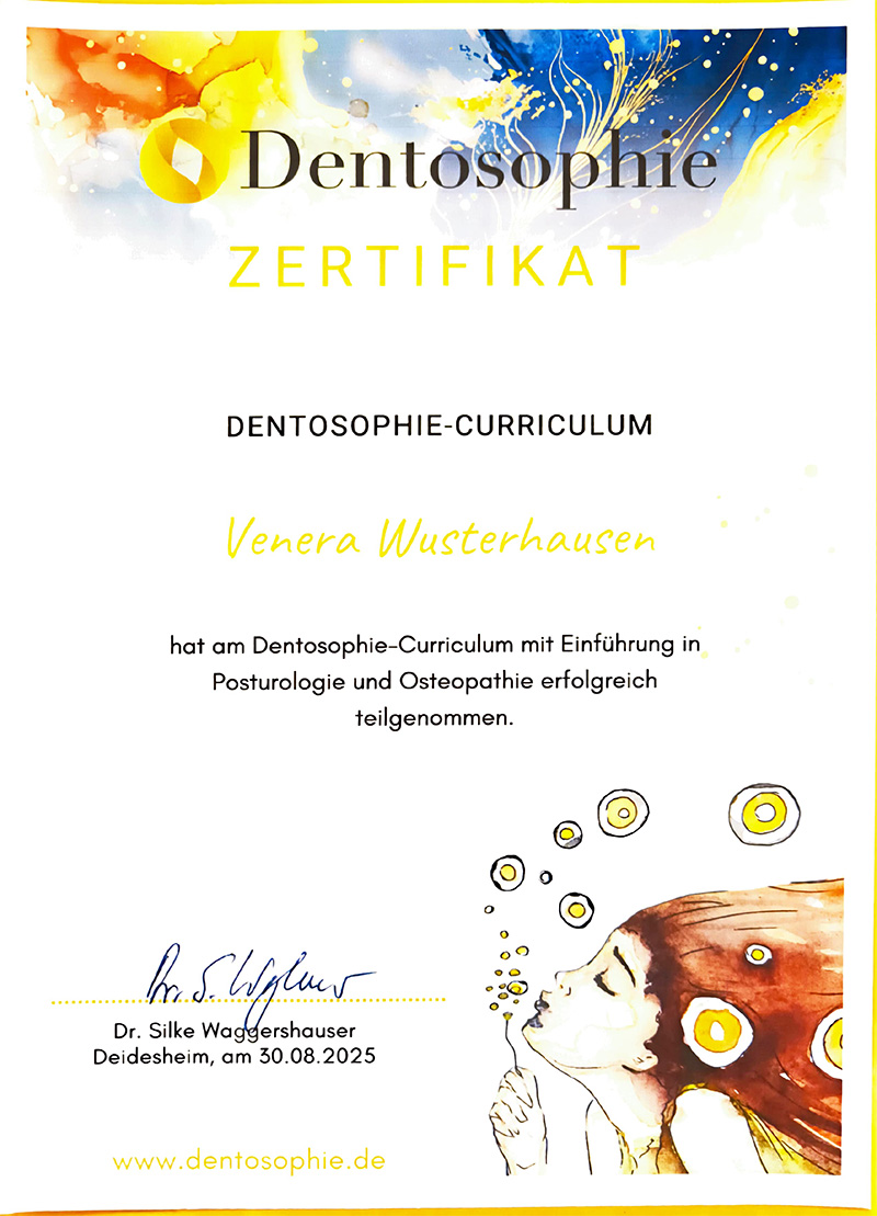 Als zertifizierte Dentosophin verbinde ich in meiner Praxis moderne Zahnmedizin mit der ganzheitlichen Lehre der Dentosophie – einer sanften Methode, die Körper, Geist und Zähne in Einklang bringt. Denn Zahn- und Kieferfehlstellungen beeinflussen weit mehr als nur das Lächeln: Sie stehen in engem Zusammenhang mit Haltung, Atmung, Konzentration und allgemeinem Wohlbefinden.